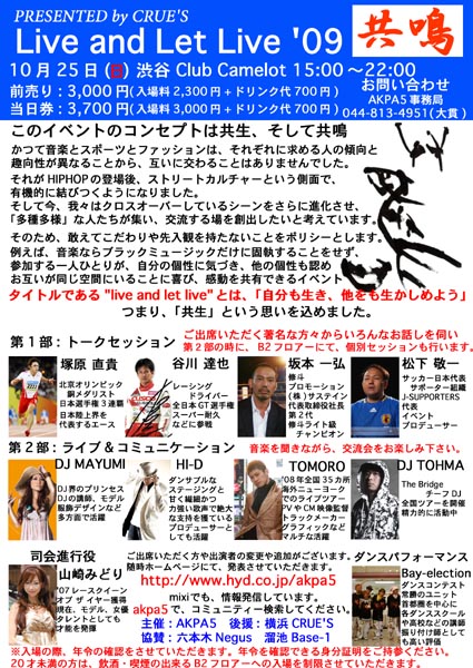 AKPA5主催 CRUE'Sプレゼンツ Live and Let Live'09 共鳴(Kyoumei) 開催日時 : 2009年10月25日(日)15:00〜 会場 : 渋谷 Club Camelot Map